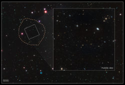 Tämä Linnunradan liepeillä seikkaileva kääpiögalaksi nimeltä Leo IV muistuttaa hiukan varhaisimpia galakseja. Sen tähtien yhteenlaskettu kirkkaus vastaa 15 000 Aurinkoa, mutta tähtien liikkeistä päätellen siinä on massaa yhteensä noin 1,5 miljoonan Auringon verran. Suuri osa massasta on siis pimeää ainetta. Valtaosa Leo IV:n tähdistä on yli 12 miljardia vuotta vanhoja. Leo IV:ssä ei kuitenkaan tällä hetkellä tapahdu uusien tähtien muodostumista. Se on saattanut menettää tähtien muodostamiseen tarvittavan kaasunsa muille galakseille. Se on niin himmeä, ettei se erotu taustataivaasta juuri lainkaan. Galaksin ulkoreunat on hahmoteltu kuvaan katkoviivoin. Kuva Nasa, ESA ja T. Brown (STScI)