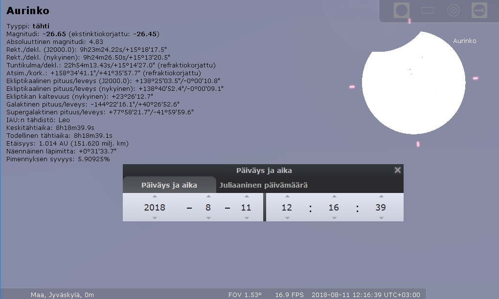 Suomessa näkyvä osittainen auringonpimennys. Näkyy koko maassa, mutta mitä pohjoisemmassa ollaan, sitä suurempi osa Auringosta on pimentyneenä. Jyväskylässä Auringosta pimenee enimmillään 13%. Tapahtumassa säävaraus.