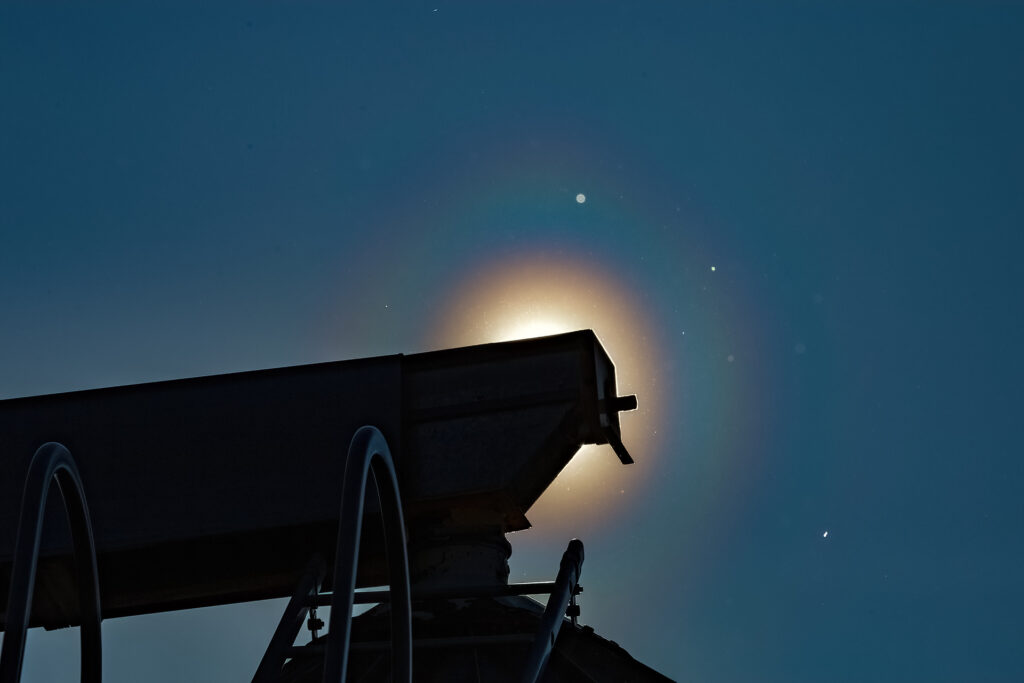 Havainnollisesti melko hiljainen toukokuu on takana ja 4.6 iltapäivä sekä auringonlasku kului lokoisesti auringon siitepölykehää bongaten. Siitepölykehän taustalla häärii mänty, ja sen näkee kehän selkeästä ovaalin muodosta. Iltapäivä sujui rauhaisasti kotitöiden, kirjoittamisen ja kuvaamisen ohella. Illan ollessa nätti ja melko vähäpilvinen, päätin jäädä jatkoille yöpilvi kytikseen. Olisi mahtavaa päästä vielä vähän liikekannalle ja saada valaisevien yöpilvien kausi käyntiin edes jollakin pienellä hahtuvalla. Valaisevat yöpilvet alias yököt eli vypit ovat siitä kiehtova ilmiö, ettei niistä tiedetä juuri mitään. Näytelmiä näkee laidasta laitaan ja kirkkaimmat näytökset lipsahtelevat silkan taikuuden puolelle. Niin tulee käymään taas tänäkin kesänä, mikäli normipilvet antavat tilaa yötaivaan näkymiseen.