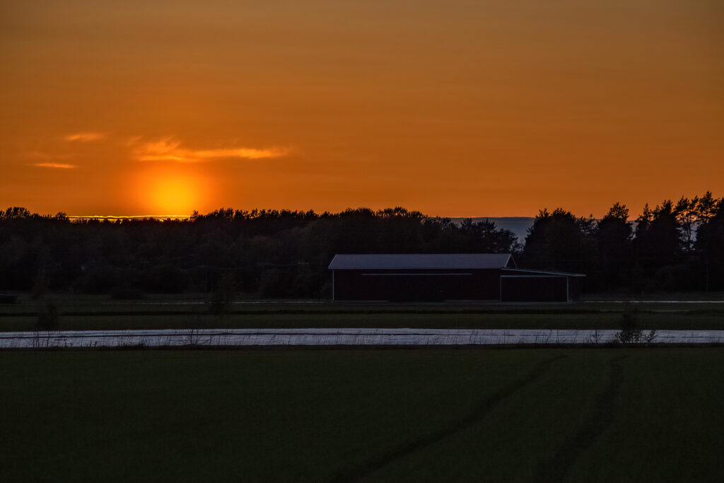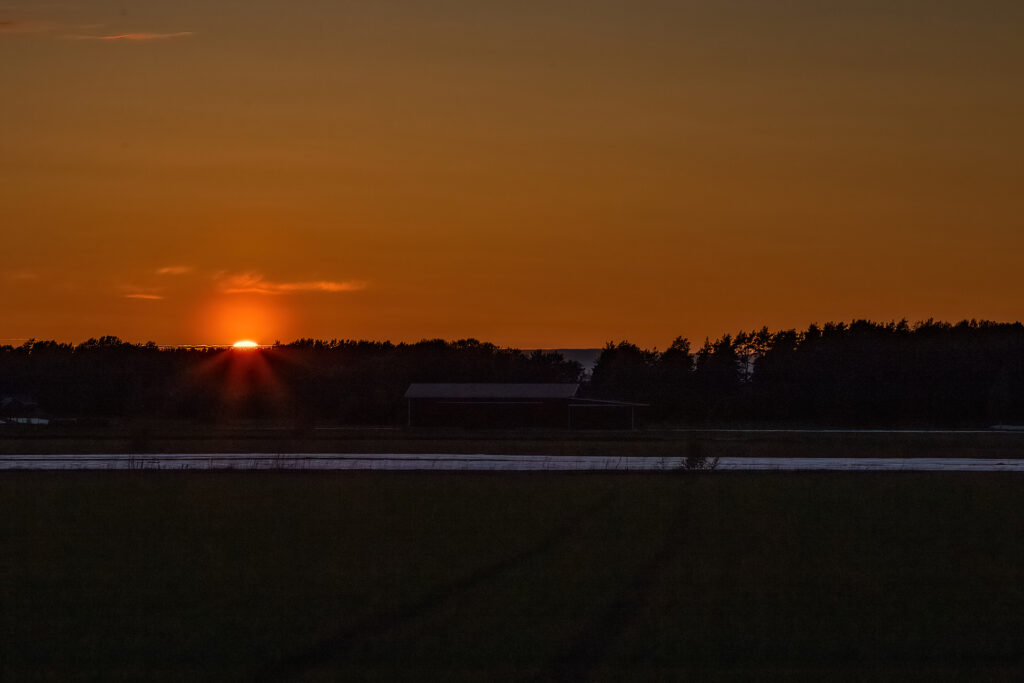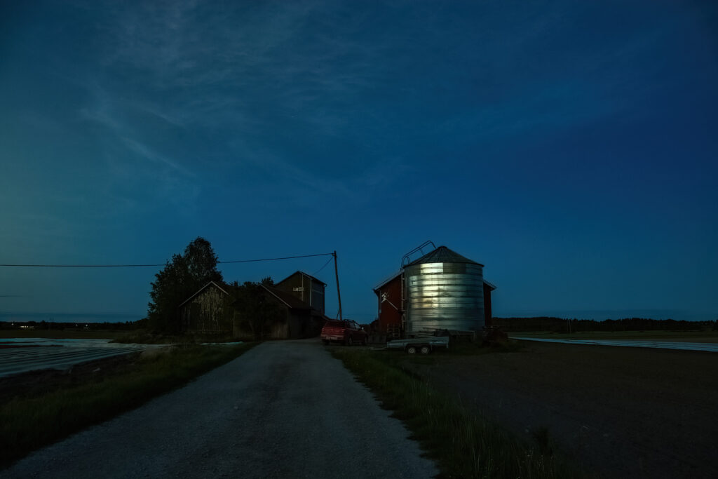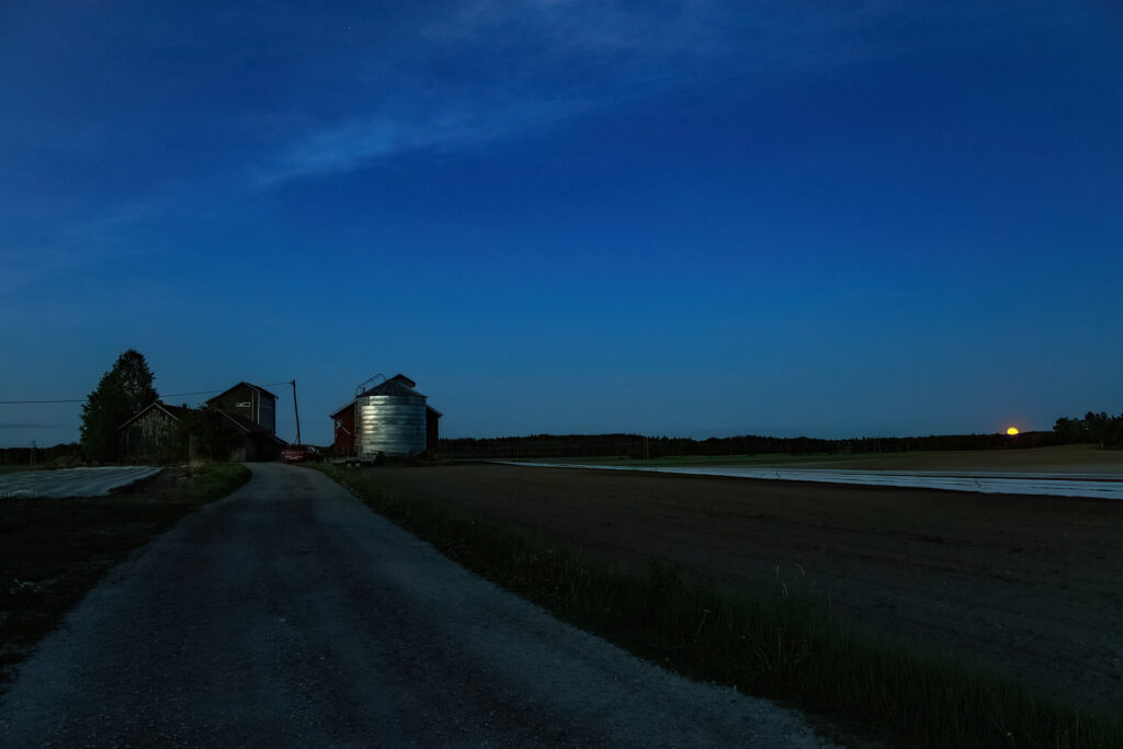 Olin sulkemassa auton takaluukkua kun näin jotain mielettömän suurta vastakkaisen pellon yläpuolella. Huuhkaja. Äänen olin kuulut useita kymmeniä kertoja vuosien saatossa, mutta itse linnun näkemiset olivat harvassa. Se lipui ilman halki hiljaisin siiveniskuin. Näky oli majesteetillinen ja tallentui verkkokalvoille ikuisiksi ajoiksi, niin vaikuttavan näköistä liitely oli. Jos jollain on iso siipien kärkiväli, niin tällä on, siis merikotkan lisäksi. Samalla yritin miettiä, minne kannattaisi suunnata kuvaaman. Kauden alussa yöpilvien määrää arvioidessa olisi hyvä oman sijainnin olla ainakin aluksi aukealla. Hirveässä paniikissa (miten ensimmäinen yö kerta toisensa jälkeen meneekin aina niin?) en keksinyt yhtään parempaa paikkaa, kuin jälleen kerran tien toisella puolella sijaitseva peltoaukea, jonne karautin autolla. Tuli hieman naureskeltua ääneen, juuri olin käynyt etsimässä uusia kuvauspaikkoja ja sitten löydän itseni kuitenkin harhailemasta naapurista…Tosin naapurissa ei ole mitään vikaa, siellä on paljon vanhoja rakennuksia, siilo, ei liikennettä ja lisäksi paikka on auki 360°. Eikä tullut pitkää kotimatkaa, nimittäin puoli kahden aikaan yöllä alkoi turnajaiskunto rapisemaan pellonpieleen ja väsymys löi kylään täydellä höökillä.