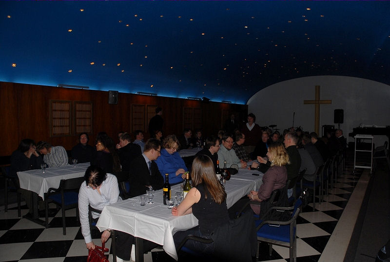 Järjestäjät olivat kyllä bonganneet varsin mielenkiintoisen illanviettopaikan. Kyseessä oli Sinitaivassali, joka on ollut aikoinaan Vapaamuurarien temppelinä, nyttemmin Suomen Liikemiesten Lähetysliiton juhlatilana. Kiinnostavinta paikassa, ja tähtipäviiin sopivana elementtinä, oli juhlatilan katto, johon oli kasattu lampuista tähtitaivas (ks. oheinen valokuva).