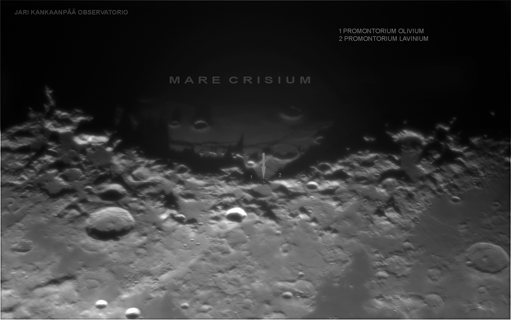 Orbiter-luotaimet kuvasivat Mare Crisiumin länsiosaa keskipäivän valaistuksessa, eivätkä ne paljoa lisänneet tietojamme alueesta. Viime vuosina digitekniikka osaavien harrastajien käsissä, ja oikeissa valaistusolosuhteissa, on paljastanut Oliviumin harjulinjan itäpuolella pienen, Auringon valaiseman kohouman. Onko tämä muoto, joka sai Wilkinsin erehtymään? Stephen James O’Meara on tutkinut aluetta, ja piirroksistaan huomannut siltamuodon ilmaantuvan, jos hetkeksi unohtaa, mistä suunnasta Aurinko paistaa!