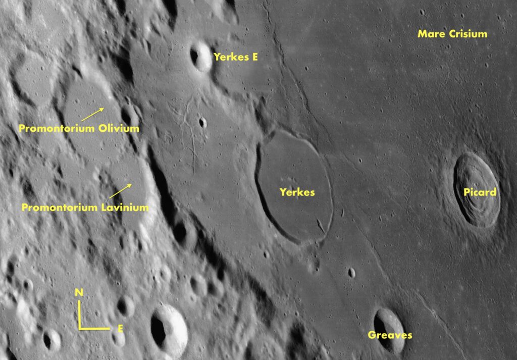 Mare Crisiumin länsireunaa. Sopivissa valaistusolosuhteissa Promontorium Lavinium ja Promontorium Olivium muodostavat siltamaisen vaikutelman, Yerkesin ja Yerkes E:n varjot taas muistuttavat lentävää kotkaa. Kartta: Virtual Moon Atlas / LRO WAC / P.C. Wirtanen.