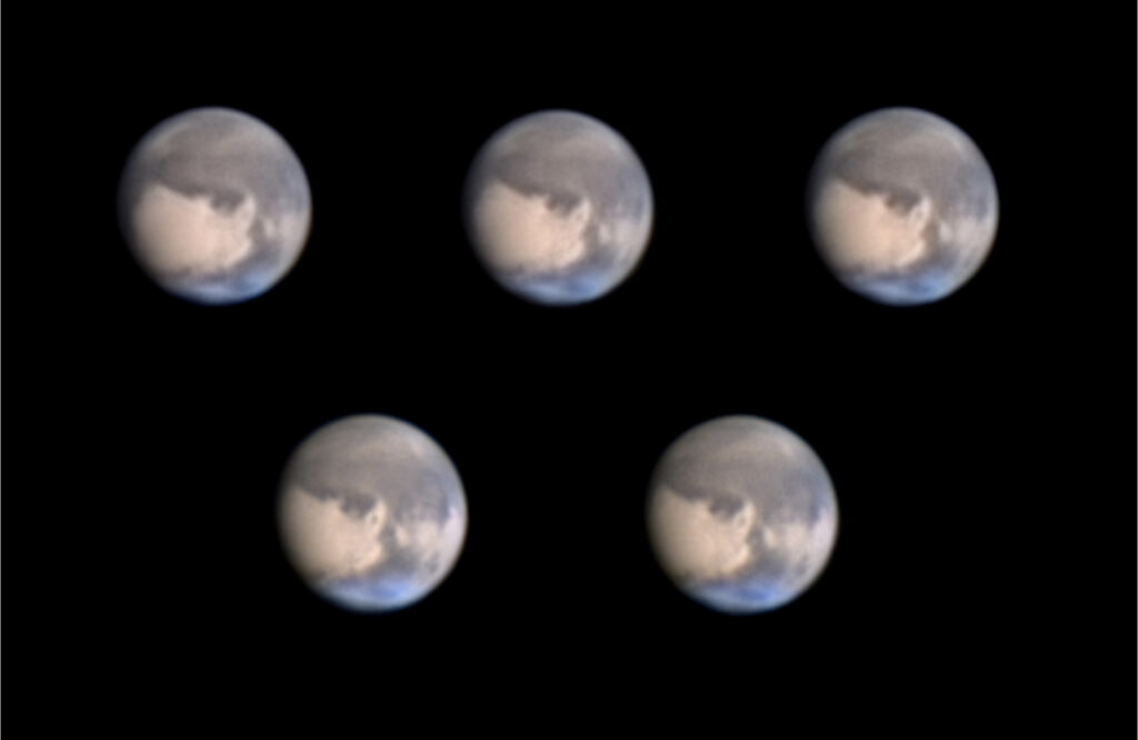 Kuva 14. Mars 12./13.11.2022 klo 23.24-0.33. CM = 350°, 354°, 357°, 5,4° ja 6,6°; kulmaläpimitta 16,3”. CPC 1100, X-Cel 2×, Neptune-C II (IR), ASI 224MC (RGB), IR-Pass 807 nm, IR/UV-poistosuodatin. Kuva: Lasse Ekblom.