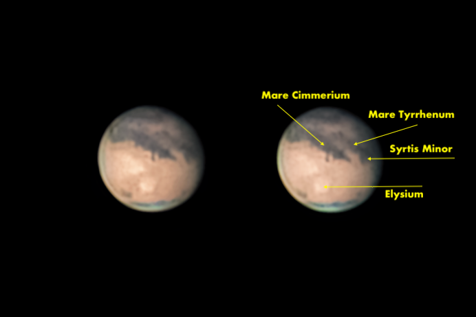 Tomi Kurrin valokuvassa (kuva 2) Mars näyttäytyy kutakuinkin sellaiselta, kuin sen visuaalisesti voisikin kaukoputkessa odottaa näkevänsä, joskin valokuvassa tummuuserot näkyvät voimakkaampina ja tarkempina. Lasse Ekblom onnistui saamaan kalustollaan hieman enemmän yksityiskohtia ja havaintoon (kuva 3) on saatu mukaan myös eteläinen napakalotti (SPC). Tumma nykerö kuvan keskiosassa on Marsin nollameridiaanilla sijaitseva Sinus Meridiani.
