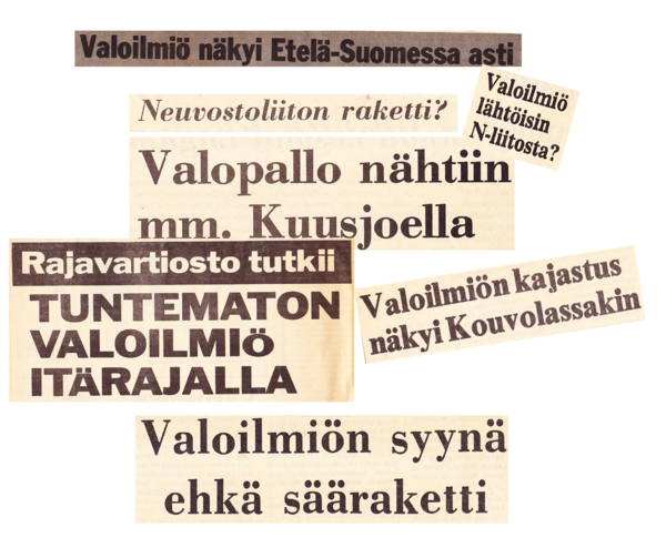Helsingin Sanomat kirjoittaa 1.3.1979 valoilmiöstä: "Voimakas valoilmiö Pohjois-Suomessa". Lehti kertoo, että Suomussalmen Jumaliskylässä valoilmiö nähtiin idässä. Se tuli alaspäin hajoten edestä ja takaa. Valoilmiö jätti jälkeensä pilven, joka levisi ja suureni koko ajan. Näkymisaika oli arviolta tunnin.