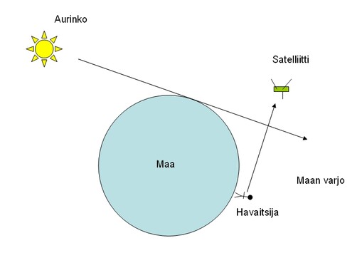 Kun aurinko laskee omassa horisontissamme, korkealla avaruudessa se näkyy horisontissa vielä jonkin aikaa. Satelliitit heijastavat Auringon valoa. Tähtikirkkaalta yötaivaalta löytämämme liikkuvan valopisteen eli satelliitin valo on siis heijastunutta valoa. Jotta voisimme nähdä satelliitin, tulee sen olla Auringon valaisema. Havaitsijan tulee olla Maan varjossa eli Aurinko on havaitsijan horisontin takana.