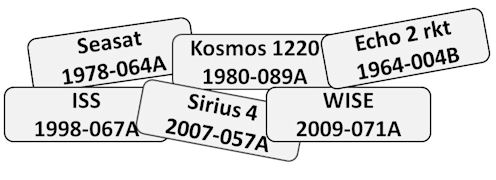 ESIMERKKI: Kansainvälisen ISS-avaruusaseman ensimmäinen kappale laukaistiin avaruuteen marraskuun 20. päivänä vuonna 1998. Avaruuasema sai luettelonumeron 25544. Designaatiokseen se sai 1998-067A. Siitä ilmenee siis laukaisuvuosi, laukaisun järjestyn ja laukaisun osa.