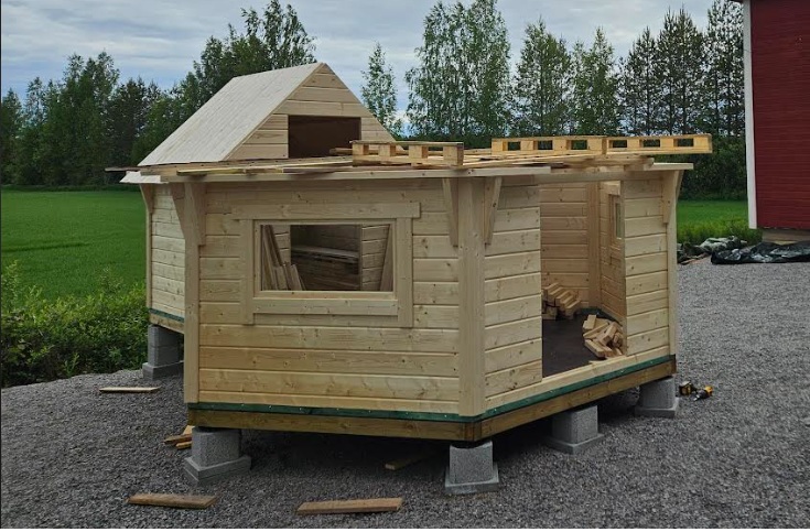 Jatkoimme viiteen pekkaan Paavolan lisärakennusten parissa muutaman tunnin juhannuksen kunniaksi! Sateeton sää suosi, tosin ötökkää olikin sitten melkein häiriöksi asti. Sisäpinnat saivat ylleen lisää puunsuojaa ja lisäsiiven (vielä huopaamaton) katto on nyt paikoillaan. Kodan kattoelementtien huopatyö on edennyt niin että ensi kerralla mietitään jo lasien kittaamista.