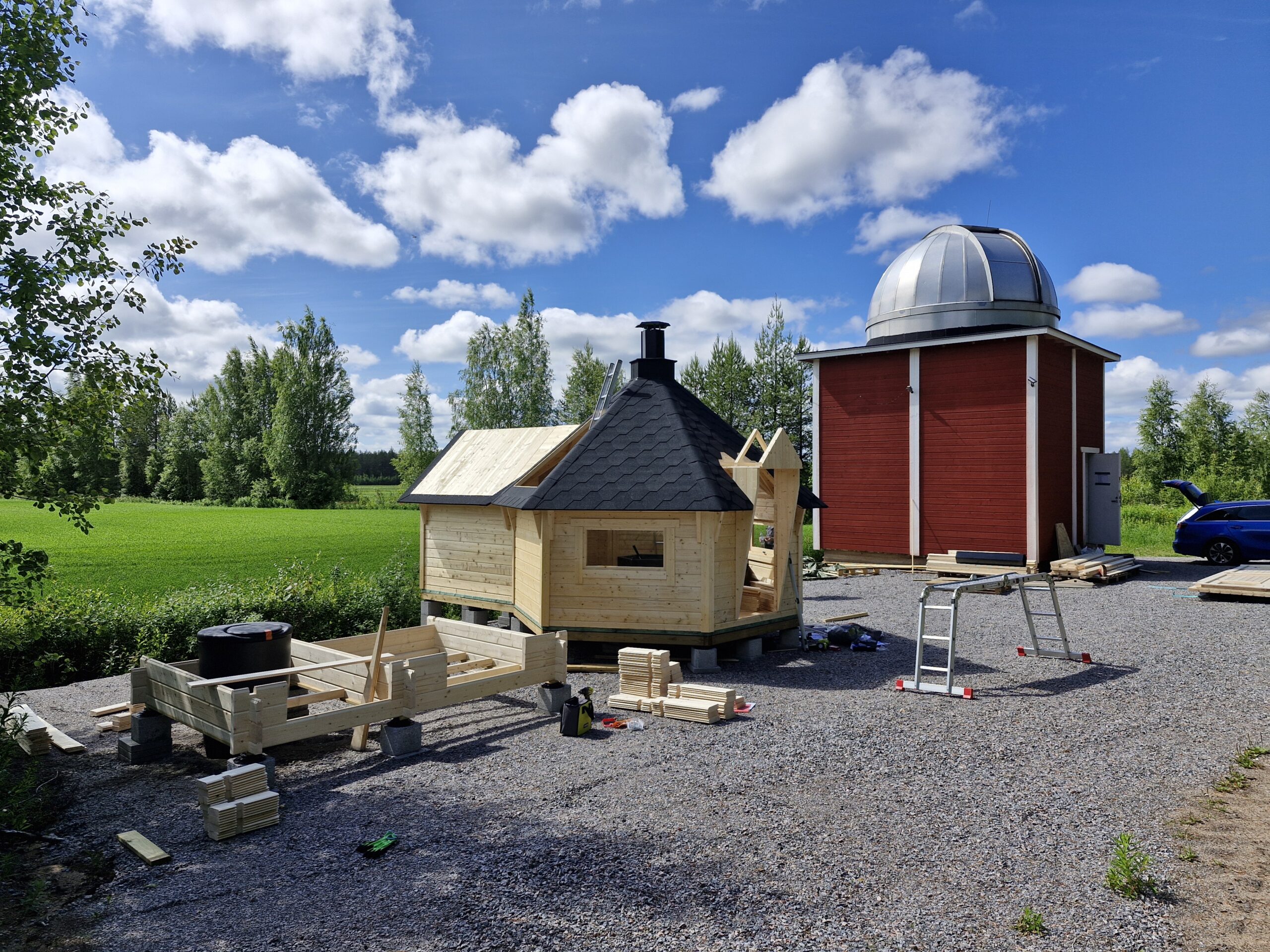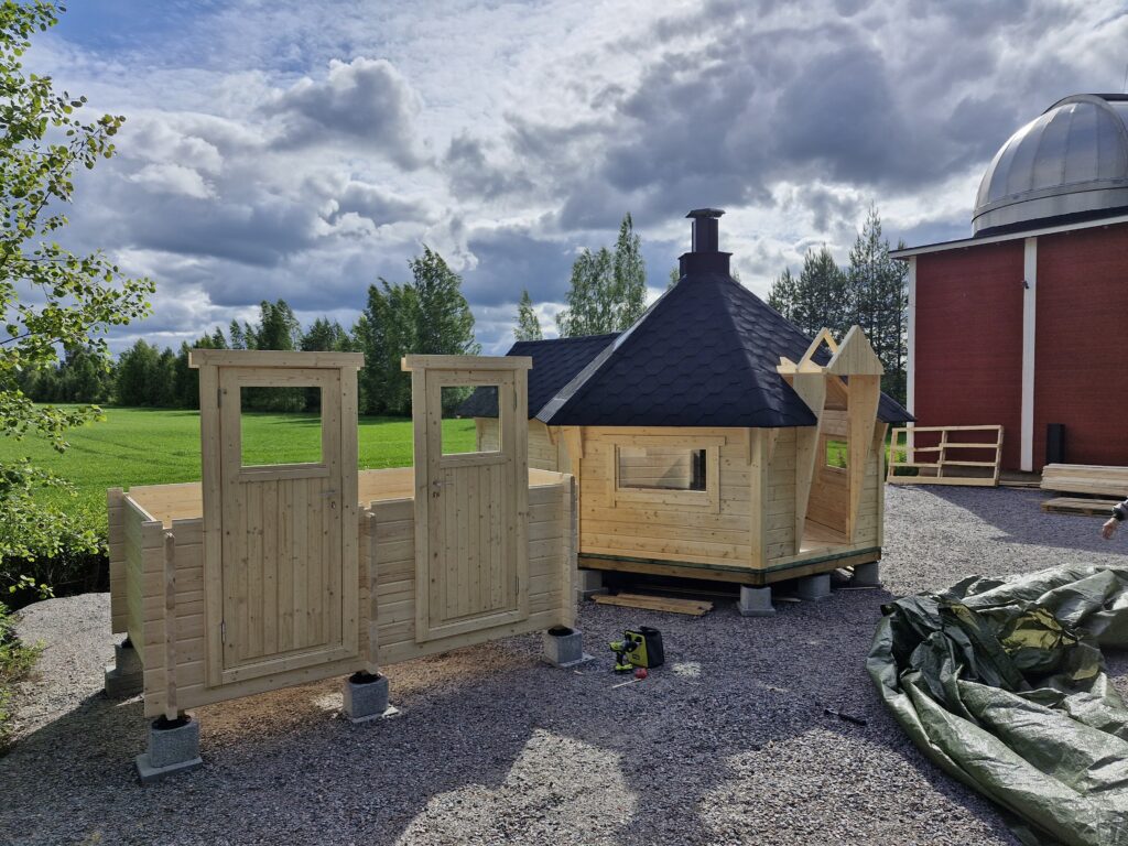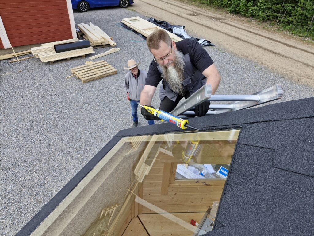 Aurinkorasvaa lisäillessä ja välipalaa haukkaillessa päivä taittui joutuin. Aurinkoisesta kesäpäivästä ehti muutenkin nauttimaan sillä Tim oli hoksannut tuoda mukanaan paarmankarkottimen. Jotenkin kummasti grillikota oli siinä taukojen välissä saanut huovat katolleen ja kattomutterin savupiippuineen. Kauan aikaa tähtitornin nurkassa odottaneet kattoikkunatkin olivat asettuneet paikalleen ja saaneet ikkunakittiä ympärilleen.