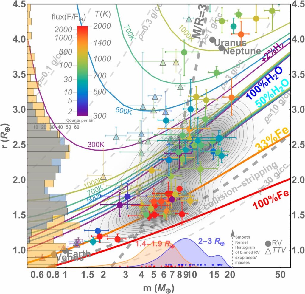 Tarkasteltaessa planeettaa lähemmin, sen 18.5 Maapallon massa ja 2.9 Maapallon säde antavat viitteitä TOI-824 b:n koostumuksesta (Kuva 2.). Vesi on yleinen planeettojen rakennusaine mutta TOI-824 b:n koostumus on yhteensopiva jopa 75-100% vedestä muodostuneen planeetan kanssa (3,4). Planeetat kuitenkin muodostuvat raudasta, nikkelistä ja silikaateista koostuvan ytimen ympärille, joten TOI-824 b:n massa ja koko sallivat vedyn ja heliumin muodostavan kaasukehän olemassaolon. Todennäköisesti planeetan ydin muodostaa sen massasta neljänneksen, sitä ympäröivä vaippa runsaan kolmanneksen ja vesi noin kolmanneksen. Vesikerroksen päällä on luultavasti vedyn ja heliumin muodostama kaasukehä, joka on huomattavasti ohuempi kuin Neptunuksella, muodostaen vain noin 3% planeetan massasta. Tämä kaikki on kuitenkin ainoastaan valistunutta arvailua, tieteellistä spekulaatiota, joka perustuu vain kouralliseen planeettoja, joiden koostumusta on voitu selvittää edes alustavasti.