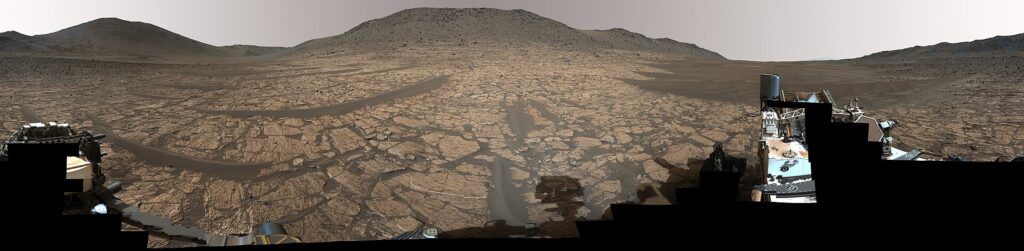 Kuva 1. Perseverance kulkijan panoramakuva Jezeron kraaterista, jossa esiintyy muinoin virranneen joen pohjaa. Kuva: NASA/JPL-Caltech/ASU/MSSS.