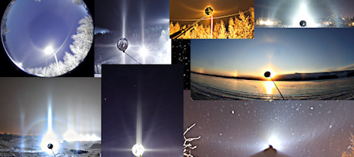 Having kept a keen eye on the weather for quite a while Marko Mikkilä and I finally managed to spent a few days (or, rather, nights) in Rovaniemi shooting halos. We observed several interesting displays the best of which featured subhorizon Lowitz arcs. Similarly, subhorizon parhelic circle was captured by placing the light source to a negative elevation.