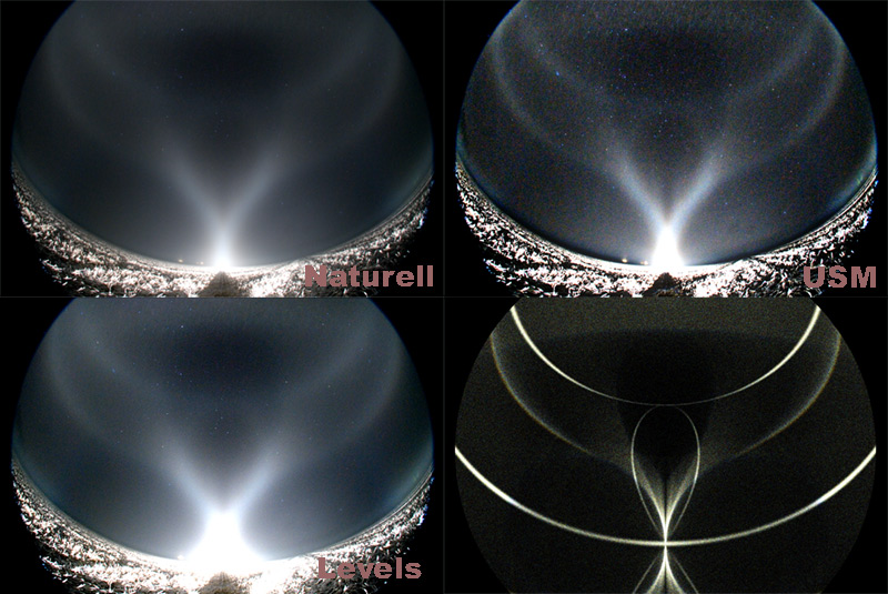 There are several interesting features in the photos (blue spot, the “dark loop” on top of diffuse arcs etc.). On the attached photo there is a rough draft simulation illustrating the different intensity effects. Obviously fine tuning has to be done. More photos and some text can be found here. A more detailed description will follow after I have had time to concentrate on the photos and simulations.