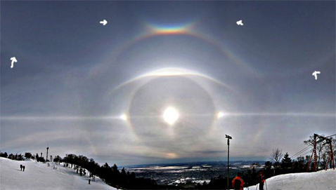 The vertical arrows in the photo denote the Wegener arc and the horizontal arrows point at faint helic arc. Dimitry described also subanthelic arc, but it is located outside the photo. More photos are also available ( 1 ).