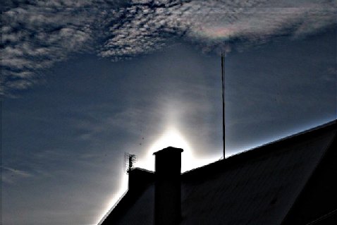 On 17 January, I (Matej Grek) went to Malenovice near Lysa hora in the Beskydy mountains to “hunt” halos in diamond dust, because humidity was near 98% and temperature below zero. However, as the temperature was still not low enough, they stopped operating the snow guns, so I went back to the train stop, and on the way, I noticed Altocumulus Virga clouds. They started to disintegrate into ice crystals … so this was the chance to see my first ellipse ever. I looked through sunglasses and there was something that looked like a sun pillar. I blocked the sun with a chimney and started taking photos. In the train I looked at them, and noticed an elliptical shape. Back at home, I stacked the images, and Marko Riikonen also helped me by creating an animation ( 1 ). It has proved to be clearly an elliptical halo – my first one.