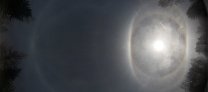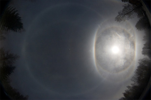 Yesterday evening I was with my HID-lamp in Himos ski resort, Jämsä, looking for some haloes. It was full moon, which is no good combination with the lamp, but I managed to get some lamp photos when moon was behind clouds. But nothing special wasn’t shown. After driving a few hours around ski resort I managed to find a place where I got some good moon haloes. Unfortunately I didn’t notice right away that my camera lens was starting to freeze which is why some of my pictures are a bit blurred. See more photos here ( 1 ).
