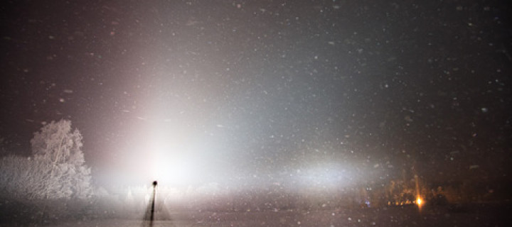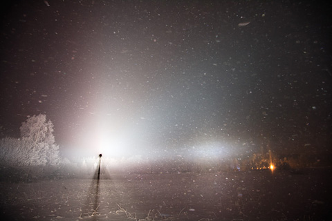 This Liljequist superparhelia was observed in the spotlight beam on 5 January 2011. The lamp is about a degree or two below the horizon, thus giving the central stage to the Liljequist superparhelia. The Liljequist parhelia can be seen against the snowy ground below the superparhelia.