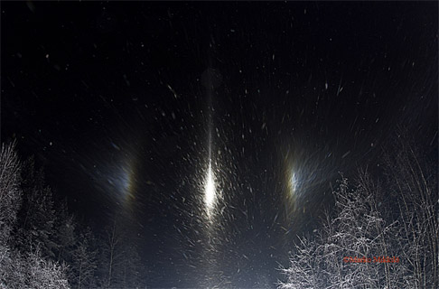 With the great lunar halo display from the beginning of the month still fresh in memory, Marko Mikkilä drove again to Sotkamo last monday. This time the catch was less spectacular, but something was nevertheless seen in the spotlight beam. Mikkilä managed place the lamp to a record negative angle of about -30° and photographed subsun and subparhelia as shown above. Click on the image to see more photos and also two videos.