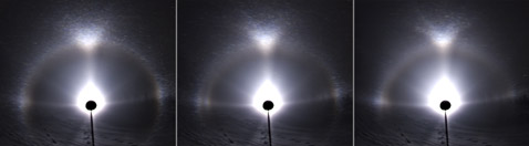 These photos and animation ( 1 ) show rather prominent effects in halos from crystal swarm density variation. Photos are from 7/8 December display in Rovaniemi.