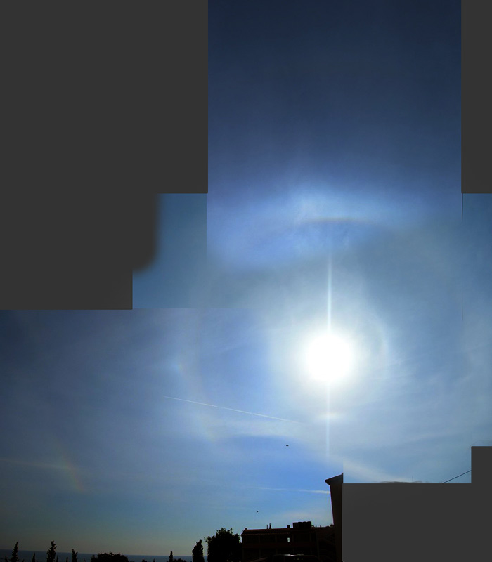 In the evening of 15th May Bernard Hulshof witnessed a fine halo display in Agios Gordis on the Greek island Corfu (composition of Bernard’s photos above). The display was dominated by pyramidal crystal halos including 9° and 24° plate and column arcs ( 1 ). Additionally 9°, 18°, 20° and 24° halos and perhaps a 23° upper plate arc can be seen in the photos. The column arcs are not very well defined indicating large tilting angles of the crystals. The large tilting angles are responsible for the column arcs spreading and forming a circular halo -type of appearence.