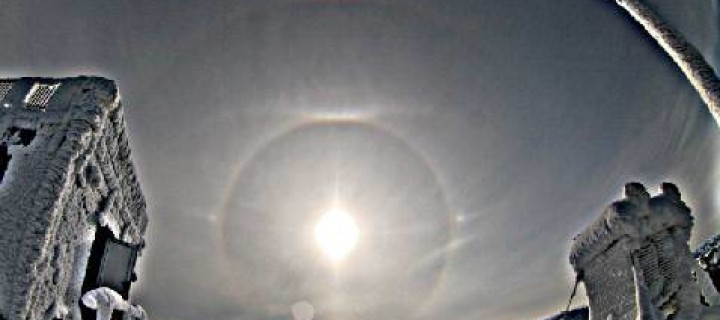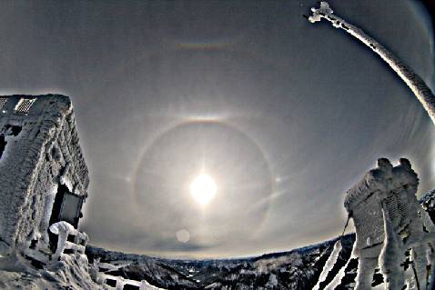 Although this year only few haloes appeared over Germany, I could observe the second complex halo display on Mt. Wendelstein ( 1 ). In the morning I saw my first subsun ( 2 ) in this year, which appeared in freezing fog. Later a veil of cirrostratus from a low pressure area over the Mediterranean Sea crossed the Alps from the south. Under those weather conditions, large halo displays can be seen very often. In my own statistics, 80% of all larger halo displays appeared when there was a southerly stream of air over the Alps, or under foehn conditions. And also this time there was a large choice of haloes ( 3 ) in the southern part of the sky, which lasted for about two hours and a half. Between 10.10 and 12.45 CET the 22°-halo, a bright upper tangent arc and a faint Parry arc, both sundogs with Lowitz arcs, the parhelic circle, an almost complete supralateral arc, a faint infralateral arc on the right side, and a complete sun pillar were visible. Unfortunately, the haloes appeared only over a small area on the northern rim of the Alps. So except of me, only my husband who was down in the valley at that time, could enjoy similar halos ( 4 ).