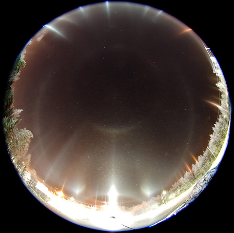 • Hmm, it just might be that we photographed and videoed a zenith spot. Last night (30-31 Jan 2009) we had a terrific halo display at Hervanta, Tampere, Finland. Later when we went home I wanted to try out if we could create some extra lights at our homeyard using a 35-watt Xenon light (3500 lumens). The result can be seen at the bottom of my wife Emma’s page (text in Finnish, but the video is pretty much self-evident).