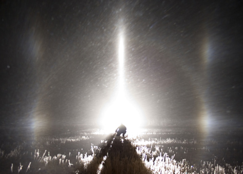 Please, folks, let’s call the upper halos in the photo superparhelia and superlamp rather than subparhelia and subsun. (I am not so concerned here with the ‘sun’ versus ‘lamp.’ It is the ‘sub’ versus ‘super’ that worries me.) So, if you take my suggestion, the superparhelia (and superlamp) are always at least as high as both the observer and the lamp, regardless of whether the lamp is above or below the horizon. And the subparhelia are always at least as low as both the observer and the lamp. Yes, the superparhelia (and subparhelia) change their appearance dramatically according to whether the lamp is above or below the horizon; that’s O.K. But they do not change their ray paths: For example, the ray path for the left subparhelion is 325, whether or not the lamp is above or below the horizon—again, this is if you follow my scheme. That is, the ray path does not change to 315 when the lamp is below, as your current usage requires. I do understand the intuition behind your naming scheme, but I think it is not so good in the long run. Thanks for listening.