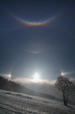 On 29 December 2007, Radomir Vondra observed a complex diamond dust display above an inversion cloud layer. He was walking to the ski slope in the village of Dolni Morava, when he saw the halos between 12:30 and 13:00. The elevation of the Sun was about 15 degrees above the horizon, and the dominant phenomena that first appeared were the parhelia and a bright circumzenith arc. Later, after the sky got clearer, a suncave Parry arc appeared above the upper tangent arc. An unsharp masked version of the photo is also available ( 1 ).