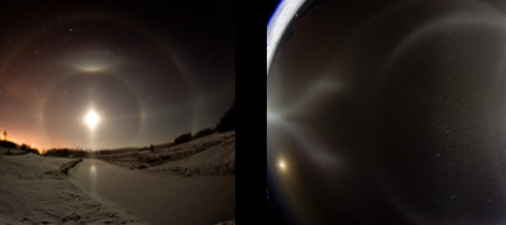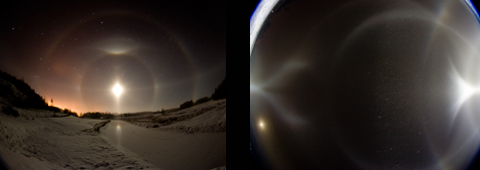 Lamp elevation was about 2 or 3 degrees. Haloes were supralateral arc, parhelic circle, Wegener, subhelic, suncave Parry, Parry supralateral, 46°halo, Tricker, Greenler, “Ounasvaara arc” ( 1 ) (first observed by Marko Riikonen -07) and more. Temperature was between -7 to -10 C. See a few pictures and videos ( 2 ).