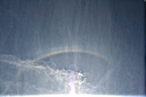 On 26 July 2009, at a sun elevation of 60.1°, I observed a second arc above the 22° halo and complete circumscribed halo ( 1 ). Besides it, there was also a CHA, and later a parhelic circle appeared. Further haloes were not present. At this sun elevation the Parry arc and the 23° plate arc are in similarly position, a precise distinction is very difficult, particularly that other observers reported further Parry arcs and other pyramidal haloes (9° and 18° halo), too. As the complete form of the arc can more or less be seen in the usm-ed image, I tend to Parry arc. This would actually be the Parry arc at highest sun elevation in the German 24-year statistic. ( 2 – 3 – 4 )