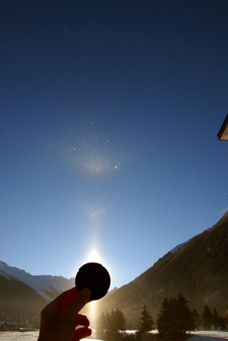 This recently seen display, although not a bright one, highlights an important issue. There is the Moilanen arc but no plate arcs. “Not the slightest hint for circumzenith arc or sundogs. Absolutely nothing”, writes Bertram Radelow, who photographed the display in Davos, Swizerland (air temp. -5°C, sun elevation 9°).