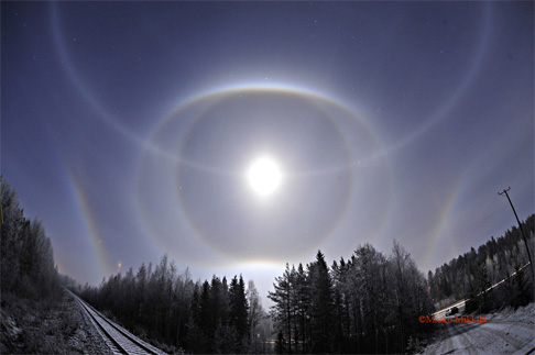 The last few postings—Toivo’s Parry arc, Mika’s lunar, and Marko M’s lunar—are all great. The oldtimers like Huygens, Bravais, and Wegener would have been thrilled to see the low sun (moon) circumscribed halos. When was the first good photograph of a low sun circumscribed halo? There are not so many of them. Look at the strength of Marko’s circumscribed halo in the 8:00 region (in the main posting); that is a region that should theoretically be weak. It is amazing.