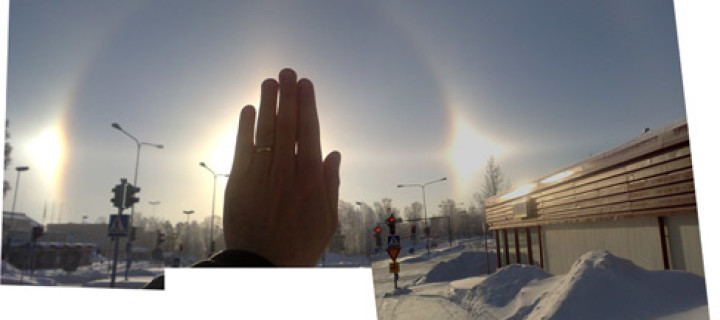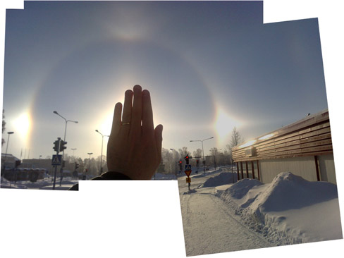 Really nice photos. What a pity that the 44° parhelia region is not there in the Kajaani photo. With such bright 22° parhelia it’d be good to see what’s there behind the building and on the left.
