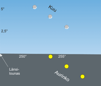 Keskiviikkoiltana 25.2. tarjoutuu iltataivaalle mahdollisuus hyvin kapean kuunsirpin bongaamiseen. Uusikuu on edellisenä yönä klo 3.35. Auringon laskee Helsingissä klo 17.37 ja Kuu vajaata tuntia myöhemmin. Pohjoisempana Suomessa laskuajat ovat vielä aikaisemmat.