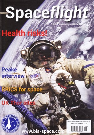 The British Interplanetary Society julkaisee Spaceflight-lehteä kerran kuukaudessa. Yhdistyksen jäsenet saavat lehden joko paperisena tai digitaalisena. Muita yhdistyksen lehtiä ovat Odyssey ja Journal. Spaceflight-lehden syyskuun 2016 numeron sisältönä on viisi laajaa artikkelia sekä 10 vakituista palstaa.