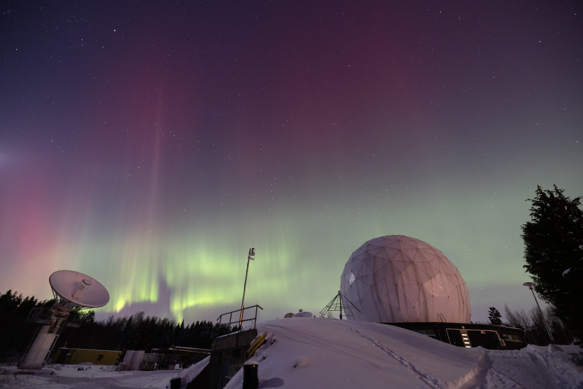 Metsähovi ja revontulia, kuva: Merja Tornikoski / Metsähovin radio-observatorio