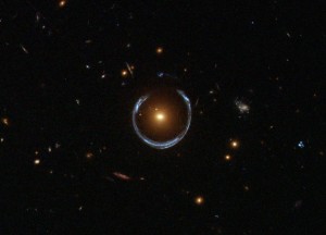 Joidenkin harvojen valonsäteiden kohdalla tosin käy niin, että valonlähteen ja meidän välille sattuu joku erittäin massiivinen kappale. Tällöin kohteen kuva vääristyy tyystin, jopa niin että kohde näkyy useassa paikassa samaan aikaan. Yksinkertaisin tapaus on Einsteinin kehä. Ajatellaan kohdetta, vaikkapa galaksia, joka lähettää valoa joka suuntaan. Jos meidän ja galaksin välissä ei olisi gravitaatiokenttiä, näkisimme vain sen valon joka tulee suoraan meille, eli galaksi näkyisi yhdessä paikassa. Jos tiellä sen sijaan on massiivinen linssi, niin osa valonsäteistä, jotka olisivat menneet meistä ohi, taipuvatkin niin että ne päätyvät silmiimme. Jos linssi on pallosymmetrinen, niin se taittaa valoa samalla tavalla kaikista suunnista, joten galaksi näkyy renkaana linssin ympärillä. Alla NASAn kuva sinisestä galaksista, jonka kuva on taittunut kauniiksi kehäksi. Tässä tapauksessa linssinä on keskellä näkyvä punainen galaksi.