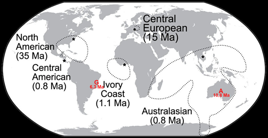 Vuosikymmenten varrella HNa/K-australiittien huomattiin olevan muutenkin omituisia. Erityisesti niiden ikä oli ongelmallinen. Muiden australaasian tektiittien havaittiin olevan geologisessa mielessä erittäin nuoria, vain noin 780 000 vuoden ikäisiä. HNa/K-australiittien ikämääritysten tulokset puolestaan väittivät niiden olevan paljon vanhempia, ehkäpä noin 11–2,5 miljoonaa vuotta (Ma). Törmäyskivien iänmääritys on kuitenkin tunnetusti hankalaa hommaa, eikä mitättömän pieni joukko kummia lasinpalasia ole ollut ongelma muille kuin hyvin pienelle joukolle tektiiteistä kiinnostuneita tutkijoita.