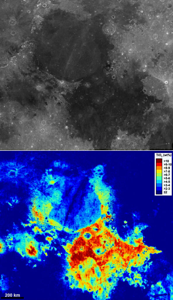 Ylemmässä kuvassa on Mare Serenitatiksen ja Mare Tranquillitatiksen alue ilman varjoja, eli kuten se näkyy täydenkuun aikaan, joskin kontrastia hieman liioitellen. Alakuvassa on saman alueen titaanidioksidipitoisuus painoprosentteina ilmaistuna. Kuva: NASA / ASU / LRO WAC / QuickMap / T. Öhman.
