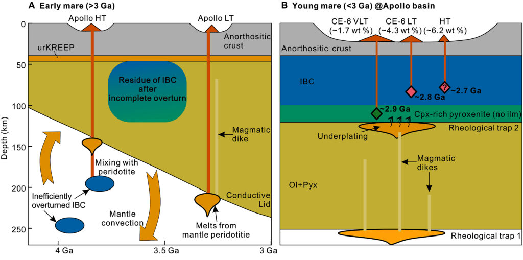 Kaavio yli (A) ja alle (B) kolme miljardia vuotta vanhojen basalttien mahdollisesta synnystä. Apollo-lennoilla tuodut vanhat HT-basaltit syntyivät ilmeniittikumulaatin (IBC) ja vaippaperidotiitin sekoittumisesta, LT-basaltit taas  suoraan vaippaperidotiitista. Chang’e-6:n nuorissa basalteissa puolestaan ei ole mukana vaippaperidotiittikomponenttia lainkaan, vaan ne muodostuivat litosfäärin altakasvun seurauksena ilmeniittikumulaatista (HT- ja LT-basaltit) tai sen alla olevasta (kuvassa vihreästä) pyrokseniittikerroksesta (VLT-basaltit). Harmaa kerros kuvaa anortosiittista kuorta ja urKREEP viittaa magmameren viimeisiin kivisuliin, joista KREEP-kivet muodostuivat. Kuvan tarkempi selitys kannattaa katsoa Wangin ja kumppaneiden artikkelista. Kuva leikattu ja kevyesti muokattu alkuperäisestä: C. Wang et al. 2025: The source and thermal driver of young (<3.0 Ga) lunar volcanism. Science Advances 11:eadv9085 / CC BY 4.0.
