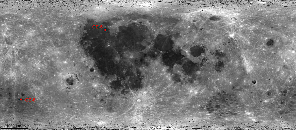 Kuun pinta ilman varjoja, jolloin koostumuseroista aiheutuvat värierot näkyvät. Kuvassa on napaseutuja lukuun ottamatta koko Kuun pinta kuvattuna siten, että Maahan päin kääntynyt lähipuoli on kuvan keskellä. Chang’e-5:n ja 6:n näytteenhakupaikat on myös merkitty kuvaan. Lähempänä napaseutuja olevat mustat pisteet ovat aukkoja kuva-aineistossa. Kuvan kontrastia on hieman liioiteltu. Kuva: NASA / ASU / LRO WAC / QuickMap / T. Öhman.