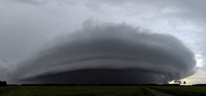Pohjanmaan ukkosten yhteydessä näkyi Kalajoella mahtava vyörypilvi. Ilmestys pääsee oikeuksiinsa oheisessa panoramakuvassa.