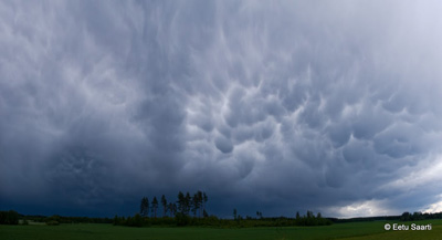 Tiistaina 21.6 kehittyi Pirkanmaalla ukkoskuuroja, joista muodostui isompi ukkosnauha idempänä. Salamointi oli paikoin aktiivista. Eetu Saarti kuvasi pilven takaosissa näkyvät mammatukset Kangasalla.
