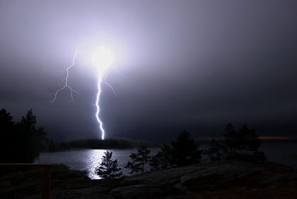 Suomenlahdelta vyöryneet ukkossolut aiheuttivat Tammisaaren saaristossa näyttävän valoshown. Maasalama iskee varsin lähelle Peter Ahlrothin kuvauspaikkaa.