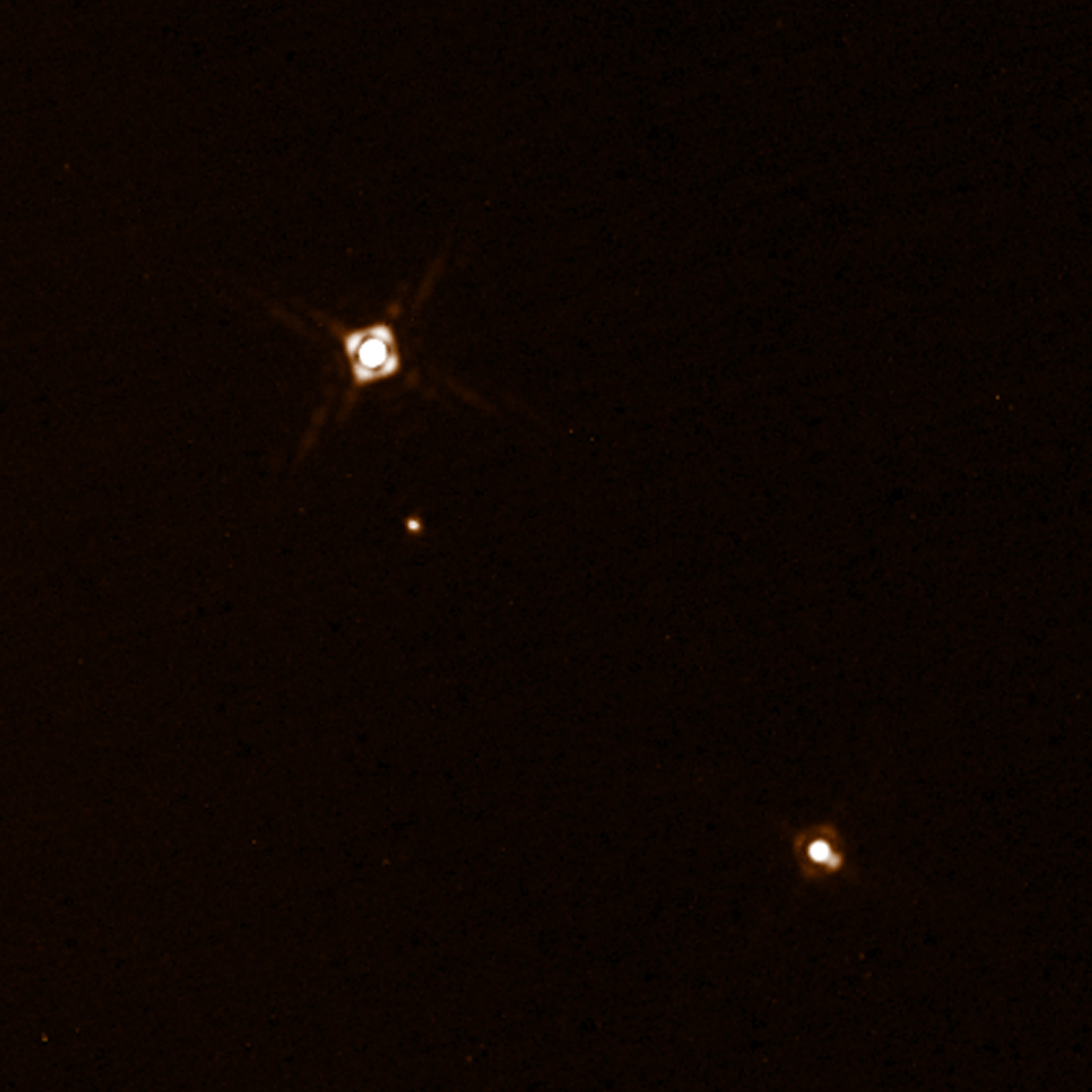 Eksoplaneettojen suora kuvaaminen on todella haastavaa, koska tähdet ovat kirkkaita ja planeetat eivät ole. Tämä kuva on parasta, mihin toistaiseksi pystytään. Siinä vuonna 2016 löydetty eksoplaneetta HD 131399Ab seikkailee kolmoistähtijärjestelmän sisällä. (Tähdet ovat kuvassa ylävasemmalla ja alaoikealla, planeetta on keskellä.) Se on kooltaan ”vain” nelisen Jupiterin massaa ja sen lämpötila on ”vain” 580 celsiusastetta, mikä tekee siitä pienimmän ja kylmimmän eksoplaneetan mitä on saatu valokuvattua suoraan. ESOn sivuilta löytyy pitkä ja seikkaperäinen teksti planeetasta suomeksi: