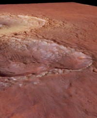 Nyt julkaistujen kuvien läntisessä osassa on 35 kilometriä halkaisijaltaan oleva kraatteri, jolla on syvyyttä noin kilometrin verran ja erittäin jyrkät reunat. Kraatterin ympäriltä löytyy useita kerroksia törmäyksen lennättämää ainesta. Paikoin nämä roiskeet ulottuvat jopa 50 kilometrin etäisyydelle.
