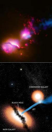 Jättiläismäisestä mustasta aukosta lähtenyt voimakas suihku näyttää törmäävän naapurissa olevaan galaksiin. Tutkijoiden mukaan tämä galaksista toiseen kulkeva suihku saattaa turmella sen tielle osuneet elämälle kelvolliset planeetat, mutta samalla myös lisätä tähtien syntyä.