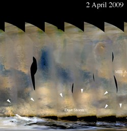 Lähestyvä kesä Marsin eteläisellä pallonpuoliskolla nostaa pölymyrskyjen määrää. Mars on tänään ratansa lähimmässä pisteessä Aurinkoa ja suurin myrskyjen määrä on luvassa lähiviikkoina kun planeetan ilmakehä eteläisellä pallonpuoliskolla lämpenee entisestään.