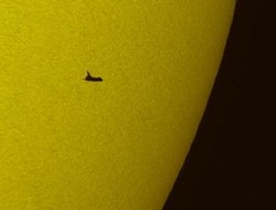 Avaruussukkula Atlantis näkyy viereisessä kuvassa tummana hahmona Auringon pinnalla. Todellisuudessa sukkula oli planeettamme kiertoradalla ja Aurinko satoja tuhansia kertoja kauempana.